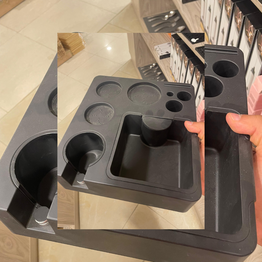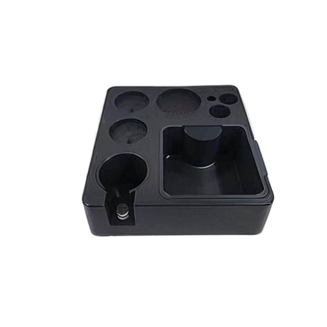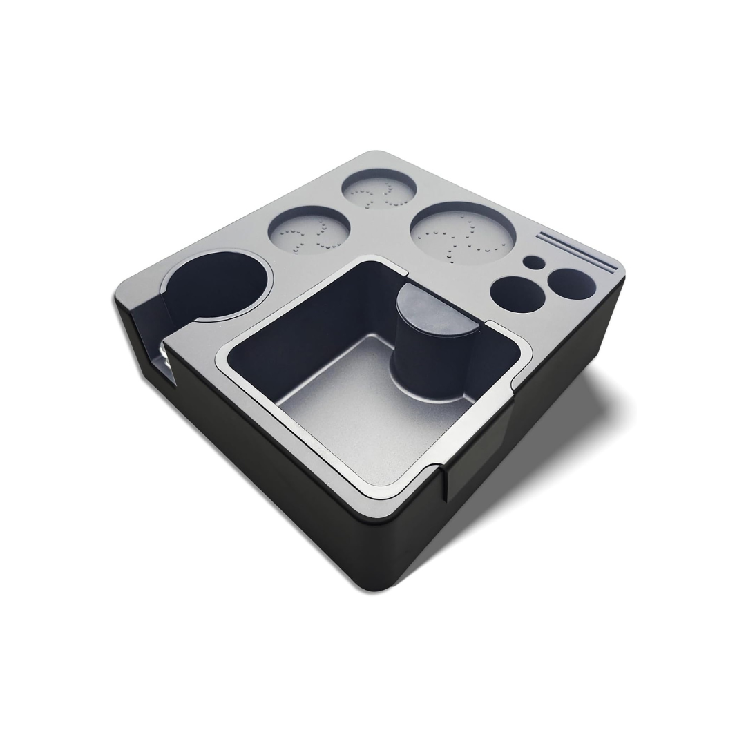 محطة كبس إسبريسو بفتحات متعددة لترتيب البورتافلتر والمكبس والأدوات. تصميم مانع للانزلاق لكبس ثابت، مدمجة ومتينة للاستخدام المنزلي أو بالمقاهي.