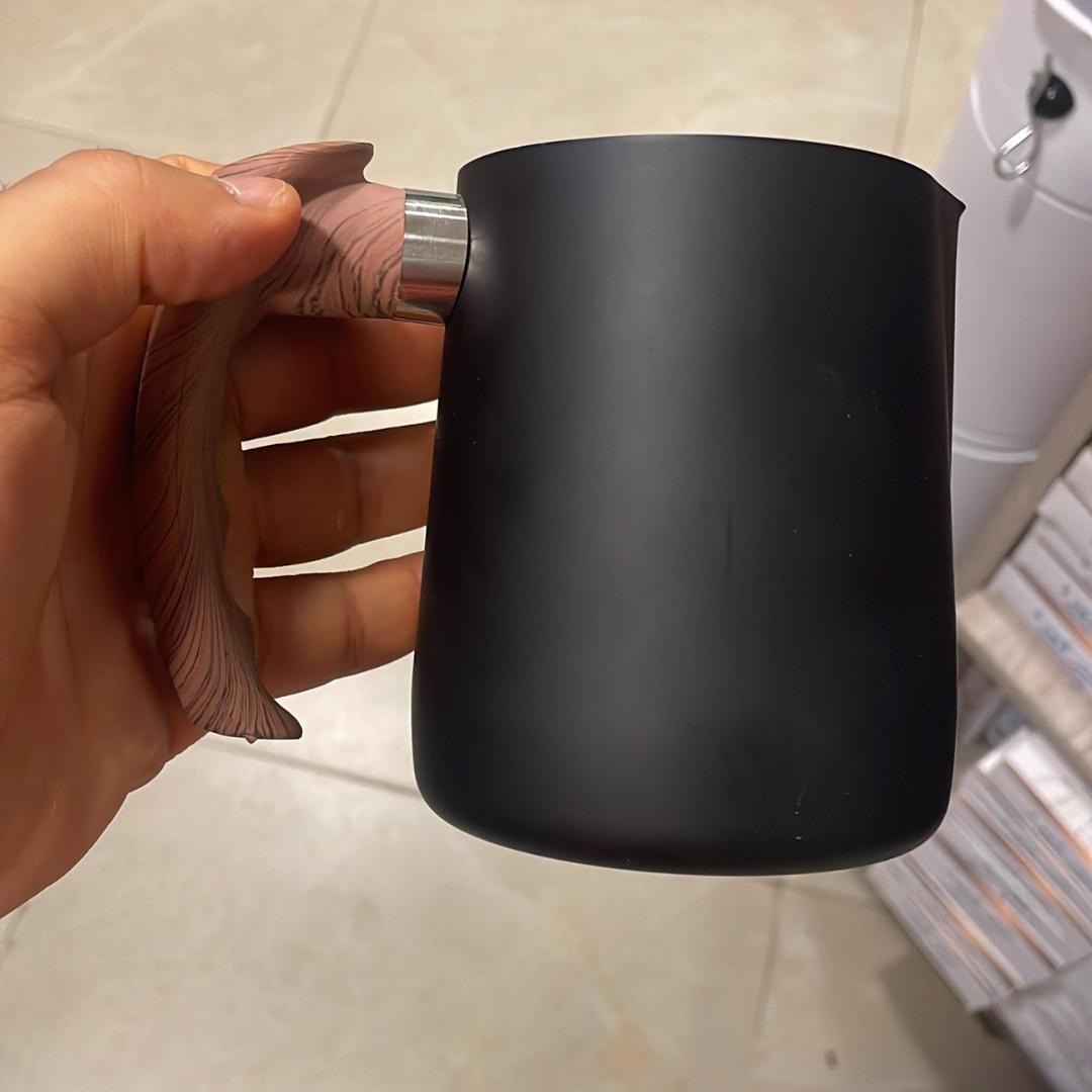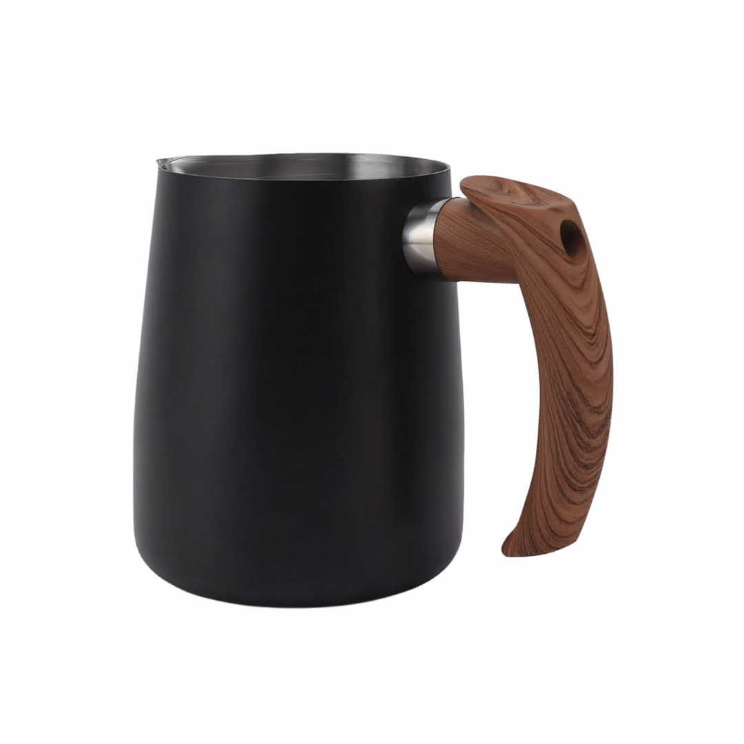 إبريق تبخير حليب من الستانلس ستيل بمقياس داخلي. مقبض أنيق بشكل خشبي وطلاء مطفي، مثالي للاتيه آرت والاستخدام في المقاهي.