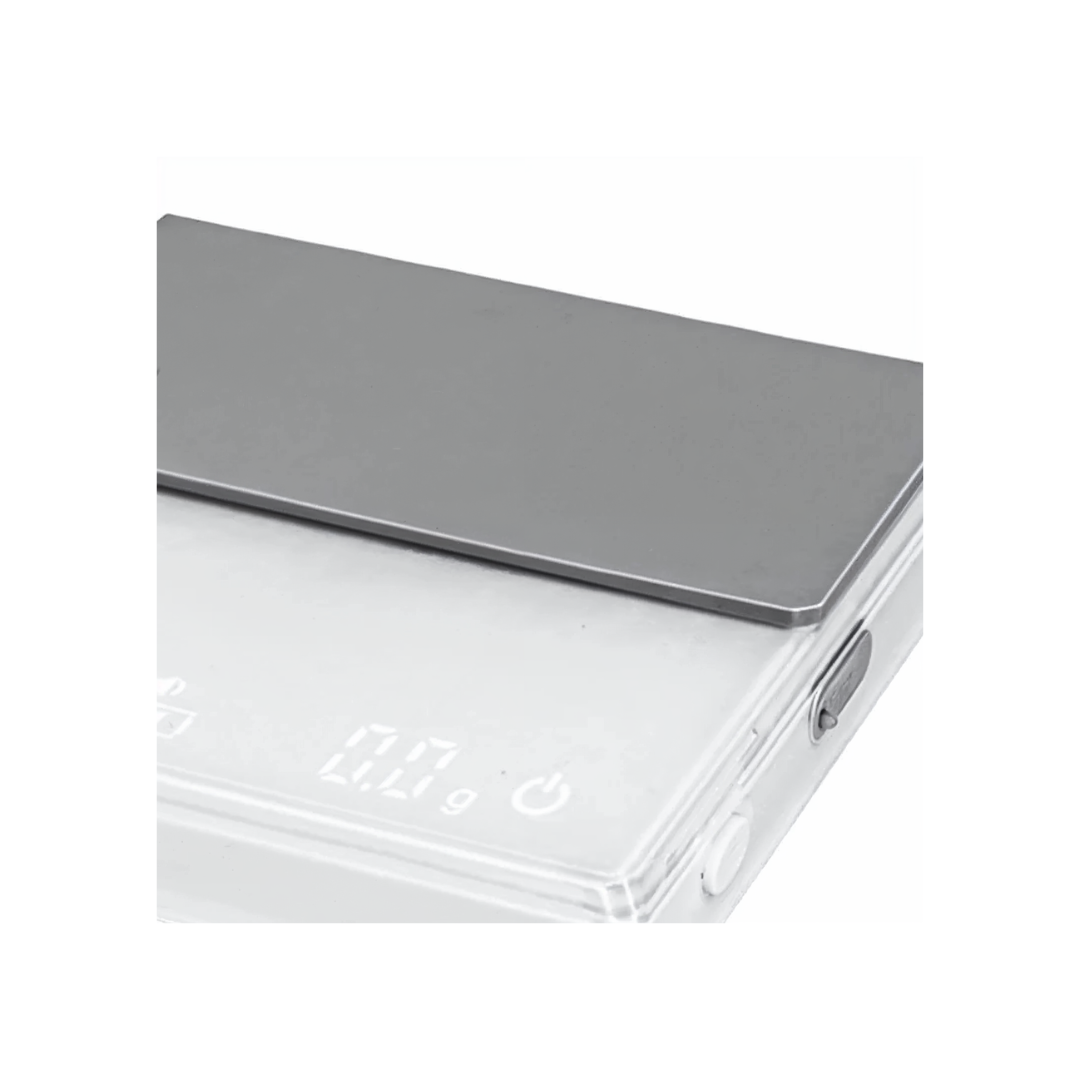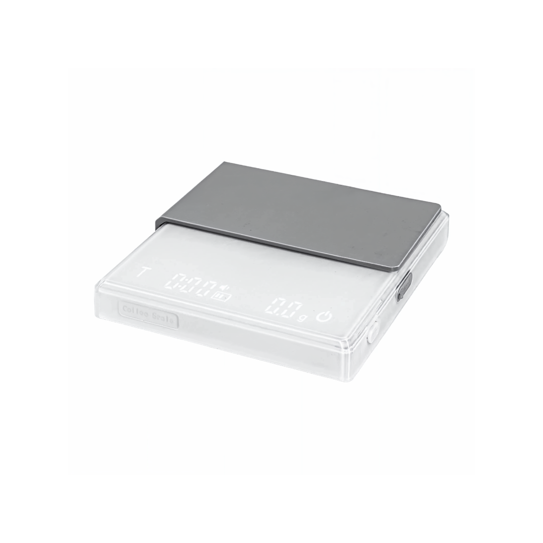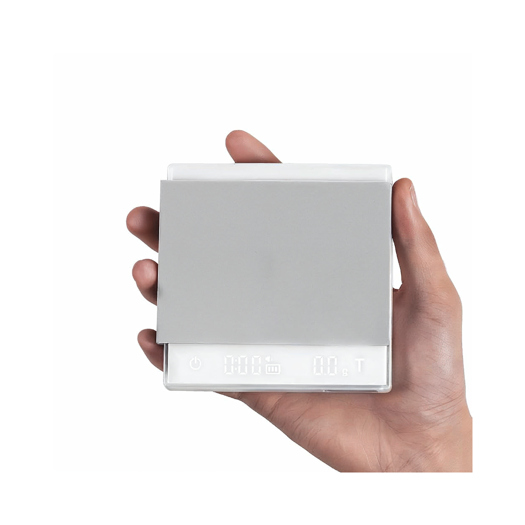 ميزان رقمي صغير الحجم بدقة ٠٫١ غرام ومؤقت مدمج. تصميم أبيض أنيق، قابل لإعادة الشحن، مثالي لتحضير الإسبريسو والقهوة المقطرة.